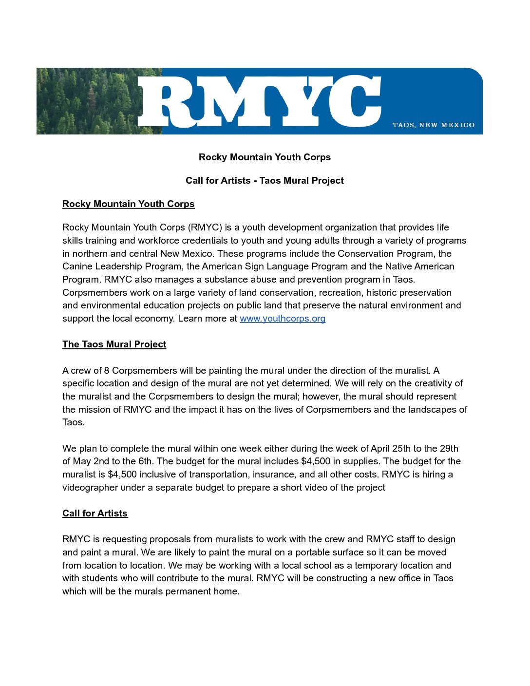 A crew of 8 Corpsmembers will be painting the mural under the direction of the muralist. A specific location and design of the mural are not yet determined. We will rely on the creativity of the muralist and the Corpsmembers to design the mural; however, the mural should represent the mission of RMYC and the impact it has on the lives of Corpsmembers and the landscapes of Taos.